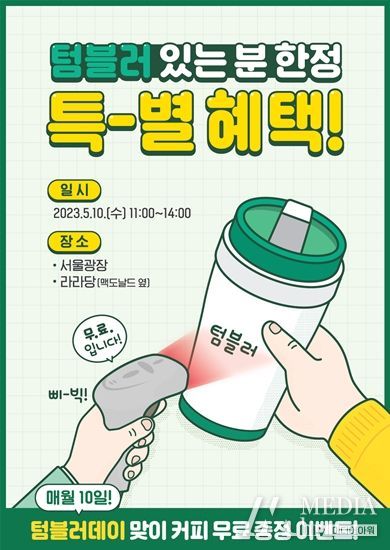 5월 텀블러데이는 1회용품 없는 날인 5월 10일 11:00~14:00 서울광장에서 텀블러(개인컵) 지참 시 음료 무료 제공 캠페인을 진행한다.