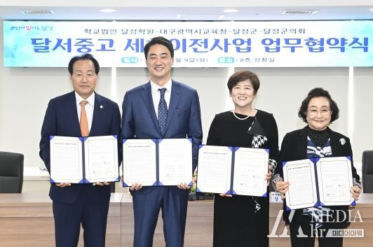 달성군은 9일 대구광역시교육청, 달성군의회 및 학교법인 달성학원과 ‘달서중·고등학교 세천 이전사업을 위한 업무협약’을 체결했다.