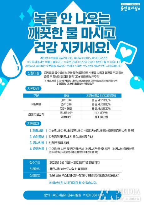 미디어아워 진금하 기자 | 용인특례시는 20년 이상 노후주택을 대상으로 수도관 교체비를 지원하는 ‘녹물없는 우리집 수도관 개량사업’의 참여자를 모집한다고 10일 밝혔다.
