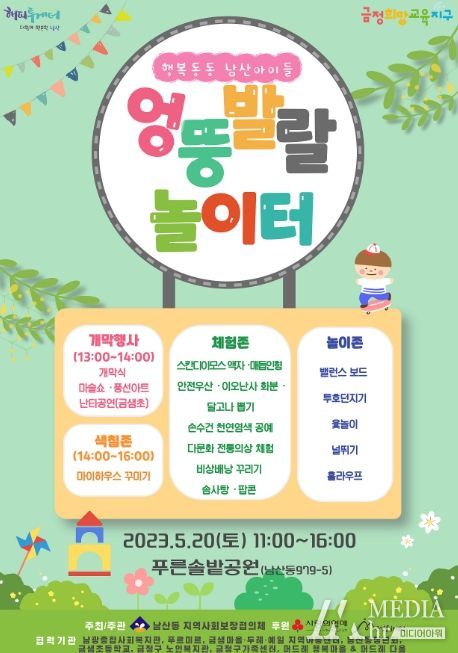 미디어아워 진금하 기자 | 금정구 남산동 지역사회보장협의체는 오는 20일 푸른솔밭공원에서 ‘행복동동 남산아이들 엉뚱발랄 놀이터’행사를 개최한다고 밝혔다.