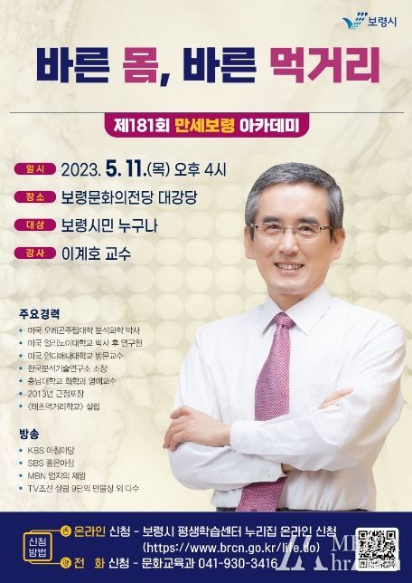 미디어아워 진금하 기자 | 보령시는 오는 11일 오후 4시 보령문화의전당 대강당에서 이계호 교수를 초빙해 ‘바른 몸, 바른 먹거리’라는 주제로 제181회 만세보령 아카데미 강연을 개최한다.