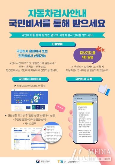 국민비서를 통한 자동차 검사 안내는 국민비서 홈페이지 또는 민간앱(국민비서 메뉴)에서 신청 가능하다. 알림을 신청한 차량은 검사기간 동안 4회 안내받을 수 있다.