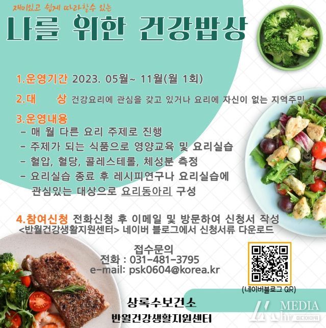 미디어아워 진금하 기자 | 안산시 상록수보건소 반월건강생활지원센터는 평소 건강 요리에 관심을 갖고 있거나 요리에 자신이 없는 반월동 지역주민을 대상으로 ‘나를 위한 건강밥상’ 참여자를 모집한다고 10일 밝혔다.