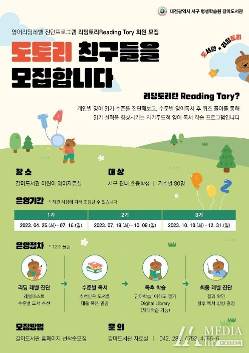 미디어아워 최지나 기자 | 대전 서구는 최근 갈마도서관에서 운영 중인 영어리딩레벨 진단프로그램 ‘리딩토리(1기)’가 인기를 끌고 있다고 10일 밝혔다.
