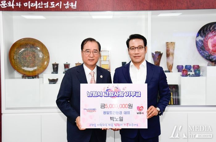 미디어아워 이호민 기자 | 박노일 재경향우이자 광일토건환경 대표가 5월 9일 남원시를 직접 방문하여 고향사랑기부금 최고액인 500만원 통 큰 기부를 했다.