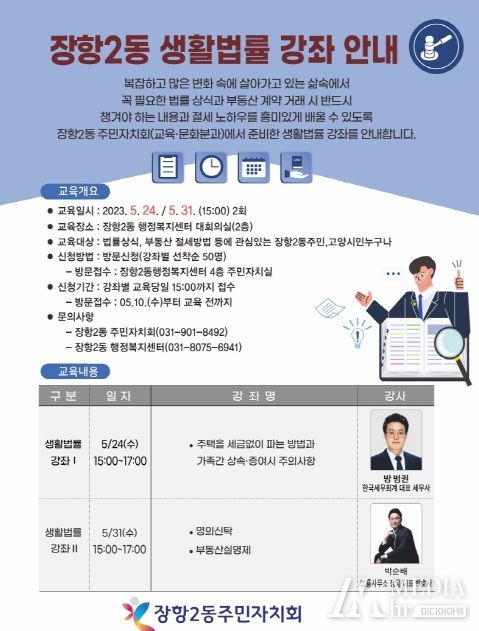미디어아워 진금하 기자 | 고양특례시 장항2동 주민자치회는 오는 5월 24일·31일에 장항2동 행정복지센터 2층 회의실에서 주민들이 재미있게 법률 상식을 배울 수 있는 ‘생활법률·세법강좌’ 교육 사업을 진행한다.