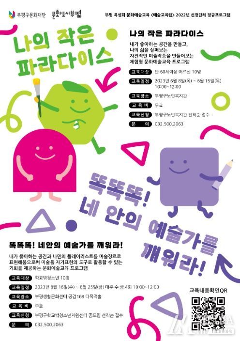 ‘똑똑똑! 네안의 예술가를 깨워라!’는 오는 8월 16일부터 25일까지 매주 수, 금요일 4회에 걸쳐 부평생활문화센터에서 진행하며, 학교밖청소년을 대상으로 한다. 교육은 내가 좋아하는 공간과 나만의 플레이리스트를 미술장르로 표현해 미술을 자기표현의 도구로 활용하는 프로그램이다.
