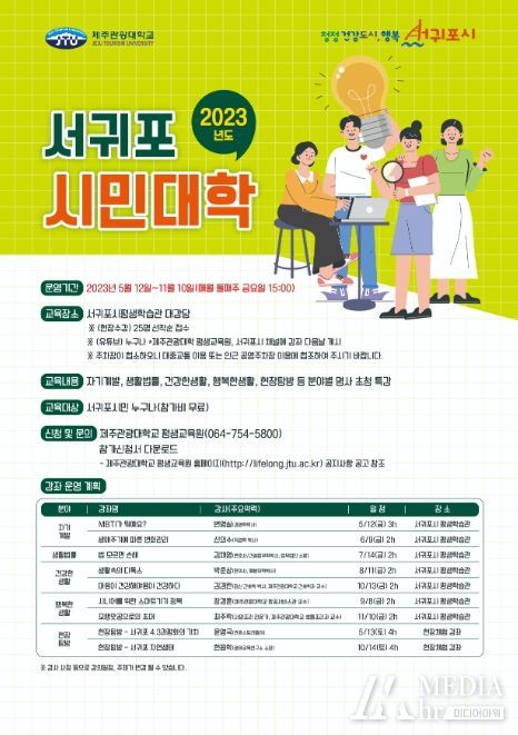 미디어아워 최지나 기자 | 서귀포시는 지역사회 평생교육 프로그램인 ‘서귀포시민대학’을 오는 12일 서귀포시평생학습관에서 개강한다.
