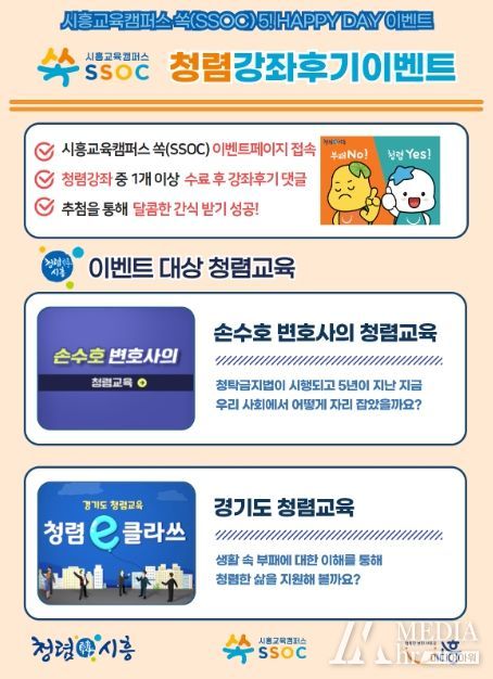 미디어아워 진금하 기자 | 시흥시는 누구나, 언제, 어디서나 학습 가능한 소통·참여형 교육 플랫폼 ‘시흥교육캠퍼스 쏙(SSOC)’에서 생활 속 청렴문화 확산을 위한 ‘청렴강좌 학습하기’ 이벤트를 오는 19일까지 진행한다.