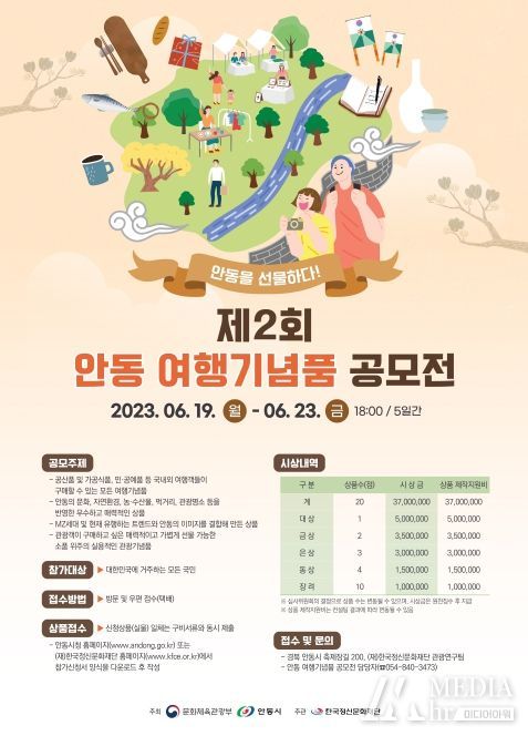 ‘안동을 선물하다! 안동 여행기념품 공모전’은 오는 6월 19일(월)부터 6월 23(금)일까지 닷새간 접수한다. 구매력이 있는 소품 위주의 실용적인 관광기념품, 유행 트렌드와 안동의 이미지를 결합해 만든 상품을 중심으로 공모하게 된다.