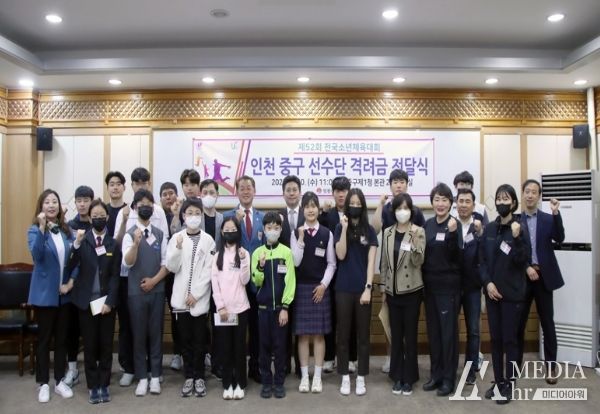 미디어아워 조연정 기자 | 인천시 중구체육회가 지난 10일 중구 제1청사 2층 상황실에서 제52회 소년체전에 출전하는 관내 선수단에게 격려금을 전달했다.