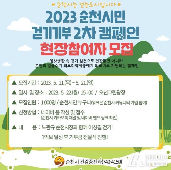 현장 참여를 원하는 시민은 오는 21일까지 네이버폼으로 신청하면 되고 1,000명을 선착순으로 접수한다. 참여 시민에게는 걷기앱 워크온(순천시 공식 커뮤니티)에서 걷기 기부증이 발급된다.