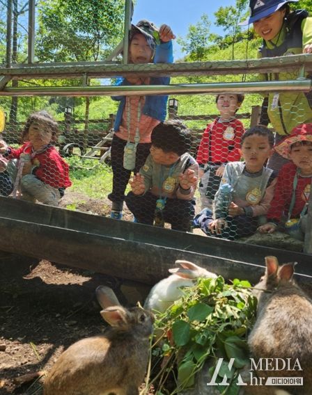 미디어아워 이호민 기자 | 10일 보성군 제암산자연휴양림 유아 숲 체험장에서 보성 별밭유치원생들이 토끼에게 먹이를 건네주고 있다.