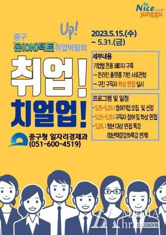 미디어아워 김성연 기자 | 부산 중구는 변화하는 취업 트렌드에 맞춰 청년들에게 다양한 취업 기회를 제공하고, 지역 기업의 구인난을 해소하기 위해 부산시 최초로 온라인(On-Line) 채용박람회를 개최한다.