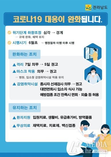 미디어아워 이호민 기자 | 전라남도가 정부의 ‘코로나19 대응 완화’ 방침에 따라 6월부터 코로나19 규제 완화를 하면서 치료비 지원 등 혜택을 유지하는 정책 내용을 도민에게 적극 알리고 있다.