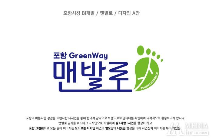 ‘맨발로(路)’는 생활권과 가까운 도시숲, 수변공간에 조성된 맨발 걷기가 가능한 포항의 산책로를 의미하며, ‘맨발로 BI’는 모든 길이 포항 그린웨이로 이어진다는 기본 모티브에 ‘길+사람+자연’을 형상화해 디자인했다.