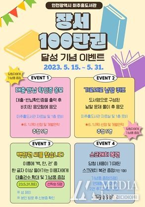 장서 100만 권 달성을 기념해 미추홀도서관에서는 5월 말까지 다양한 이벤트를 진행한다. 먼저 대출·반납 확인증을 추첨해 경품을 증정하는 '대출·반납 확인증 응모', 도서명으로 구성된 문제를 풀고 경품에 응모하는 '가로세로 낱말 퀴즈', 이름에 ‘백, 만, 권’중 한 글자 이상 들어가는 이용자에게 대출 권수 2권 추가 등의 혜택을 제공하는 '백만권씨를 찾습니다'와 연체 해제권 등을 제공하는 '스크래치 복권' 이벤트를 운영할 예정이다.