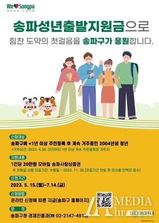 미디어아워 김성연 기자 | 송파구가 성년의 날을 맞아, 사회에 첫발을 내딛는 2004년생 송파구 청년들을 응원하고자 ‘성년출발지원금’을 지급하고 성년 축하카드를 발송한다고 14일 밝혔다.