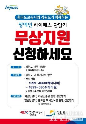 미디어아워 조연정 기자 | 평창군은 15일부터 한국도로공사 강원본부와 협업으로, 장애인들의 고속도로 이동 편익을 제공하기 위해 장애인차량 하이패스 감면단말기 지원 사업을 실시한다고 밝혔다.