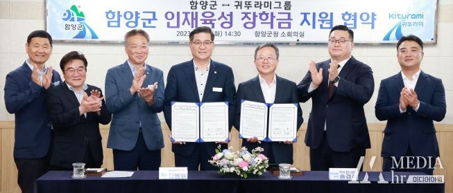 미디어아워 김성연 기자 | 함양군은 5월 16일 오후 소회의실에서 귀뚜라미그룹과 함양군 저소득가정 인재육성을 위한 장학금을 지원하는 내용의 협약을 체결했다.