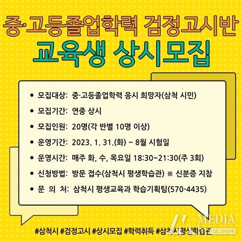 한편, 삼척시 평생학습관에서는 중등졸업학력·고등졸업학력 검정고시 2개 반을 제2회 검정고시 시험일(8월 중)까지 운영 중이며, 학력 취득을 희망하는 삼척시민이면 누구나 무료로 수강이 가능하고, 희망자는 평생학습관에 방문(또는 전화)하여 교육과정 상담 및 접수하면 된다.