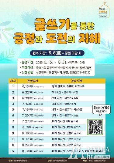 미디어아워 조연정 기자 | 대전 대덕구 신탄진도서관은 문화체육관광부가 주최하고 한국도서관협회가 주관한 ‘도서관 지혜학교’ 공모사업에 선정돼 오는 6월 15일~8월 31일 프로그램을 운영한다.