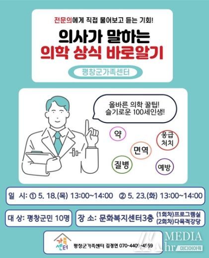 미디어아워 조연정 기자 | 평창군이 지원하는 평창군가족센터는 5월 18일, 5월 23일 총 2회에 걸쳐‘의사가 말하는 의학상식 바로알기 사업’을 시행한다.