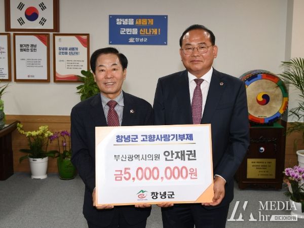 미디어아워 조연정 기자 | 창녕군은 안재권 부산광역시의원이 지난 18일 고향사랑기부제 연간 최고 기부금액인 5백만 원을 창녕군에 기부했다고 밝혔다.