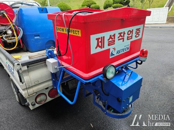 소형 제설제 살포기는 운전석에서 제설제 살포량을 조절할 수 있으며 1t 트럭에 탑재 탈부착이 가능하다.
