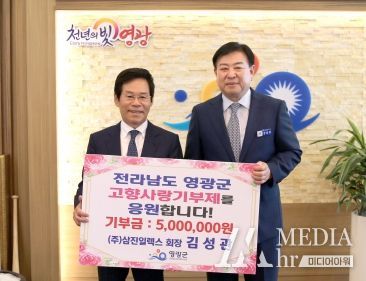 미디어아워 김성연 기자 | ㈜삼진일렉스 김성관 회장이 지난 19일 영광군을 방문하여 고향사랑기부금 최고액인 5백만 원을 기부하여 고향에 온정의 마음을 전했다.