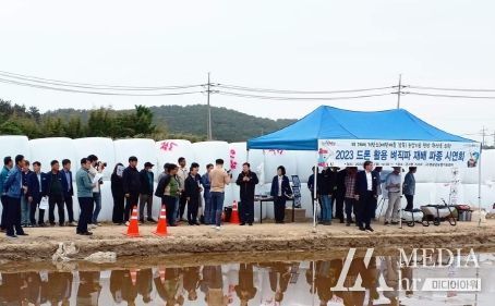 미디어아워 김성연 기자 | 영광군은 지난 22일 영광군 군서면 일원에서 70명의 관내 농업인들이 참석한 가운데 ‘2023 드론 활용 벼 직파재배 파종 시연회’가 성공적으로 진행됐다고 밝혔다.