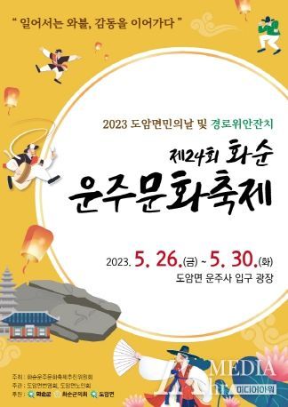 미디어아워 김성연 기자 | 2023년 도암면민의 날과 경로위안잔치를 병행한 제24회 화순운주문화축제가 5월 26일부터 30일까지 천불천탑 신비가 깃든 화순군 도암면 운주사 일원에서 “일어서는 와불, 감동을 이어가다”라는 주제로 열린다.