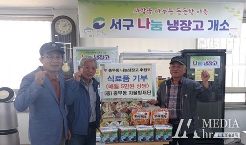 미디어아워 김성연 기자 | 부산 서구 충무동 나눔 냉장고에 지난 23일 기부자 23호 충무동 자율방재단에서 라면, 김 등 (5만원 상당)의 식료품을 기부해주었다. 충무동 자율방재단 단장 김문홍님은 “충무동 공동체나눔문화 활성화를 위해 매월 5만원 상당의 식료품을 지원하기로 단원들의 뜻을 모았다.”고 전했다.