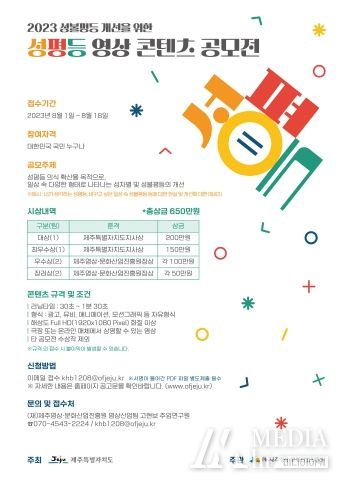 미디어아워 김성연 기자 | 제주특별자치도와 (재)제주영상·문화산업진흥원은 ‘2023 성불평등 개선을 위한 성평등 영상콘텐츠 공모전’을 개최한다.