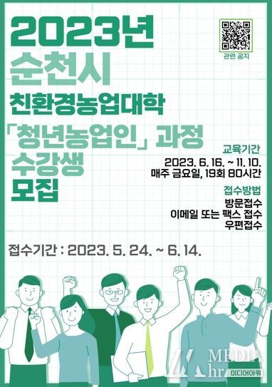 미디어아워 이호민 기자 | 순천시는 농업·농촌을 이끌어갈 청년농업인을 육성하기 위해 2023년 친환경농업대학 ‘청년농업인’과정 교육생을 6월 14일까지 모집한다.