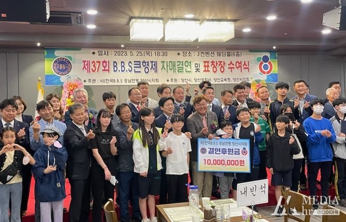 미디어아워 이호민 기자 | (사)한국B.B.S경남연맹양산시지회는 지난 25일 어려운 환경에서도 학업을 이어가고 있는 청소년들을 지원하기 위하여 청소년 23명과 B.B.S 위원들이 결연을 맺고 7명의 모범 청소년에게 표창장 수여식을 가졌다.