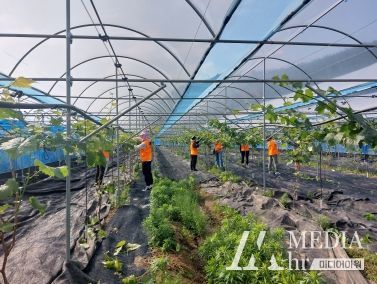 이날 직원들은 이른 아침부터 용전리에 위치한 포도밭에 찾아가 서툴지만 작은 보탬이 되기 위해 포도 순 따기 작업에 최선을 다했다