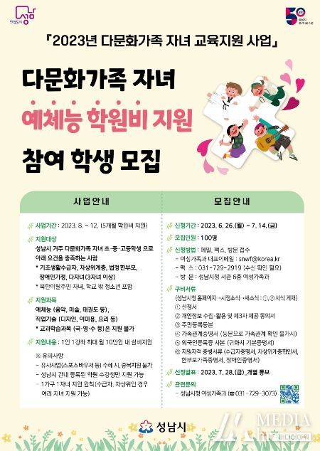미디어아워 기자 | 성남시는 다문화가족 자녀에 오는 8월부터 연말까지 5개월간 월 최대 10만원의 예체능 학원비를 지원한다고 26일 밝혔다.