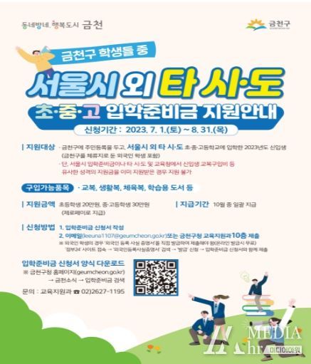 미디어아워 기자 | 금천구는 서울시 외 타 시·도에 소재하는 초․중․고등학교에 입학한 금천구 신입생 중 입학준비금을 지원받지 못한 학생에게 입학준비금을 지원한다.