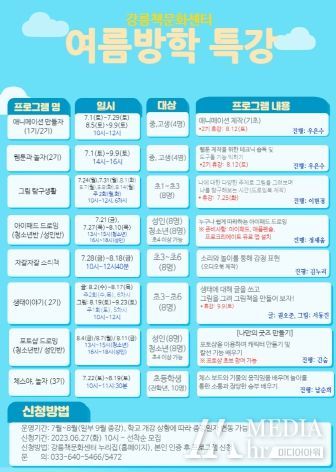 이번 여름방학 특강 프로그램은 오는 27일(화) 오전 10시부터 선착순으로 모집하고, 자세한 내용 및 신청은 강릉책문화센터 누리집을 참고하면 된다.