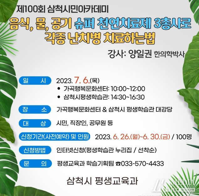 미디어아워 기자 | 삼척시는 오는 7월 6일(목) 오후 2시 30분에 평생학습관 대강당에서 개최하는 제100회 삼척시민아카데미 참여자를 모집한다고 밝혔다.