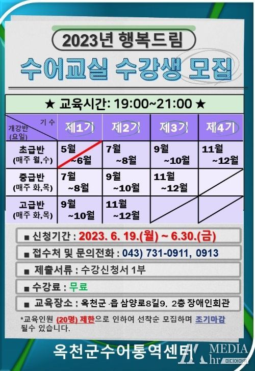 미디어아워 기자 | 옥천군수어통역센터은 옥천군에 거주하는 건청인 및 농인, 문해농인을 대상으로 ‘2023년 행복드림수어교실’ 2기 초급반 수강생 20명을 선착순 모집한다.
