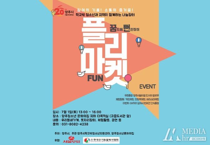 미디어아워 기자 | 양주시학교밖청소년지원센터는 오는 7월 1일 양주청소년문화의집에서 양주청소년문화의집, 지역공동체 해랑마을과 연계해 나눔장터 ‘꿈·뻔 플리마켓’을 개최한다.