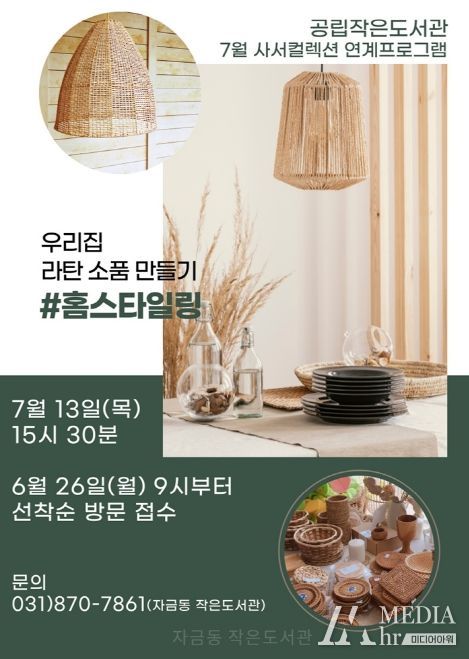 미디어아워 기자 | 의정부 공립 작은도서관은 7월 사서컬렉션 ‘홈스타일링’을 주제로 자금동 작은도서관에서 연계프로그램 ‘우리집 라탄 소품’을 운영한다.