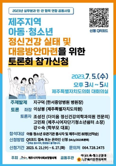 미디어아워 기자 | 제주시는 7월 5일 제주특별자치도의회 대회의실에서 제주지역 아동·청소년 정신건강 실태 및 대응 방안을 위한 토론회를 개최한다.