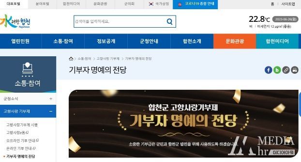 미디어아워 기자 | 합천군은 ‘고향사랑기부제 온라인 명예의 전당’을 개설했다고 26일 밝혔다.