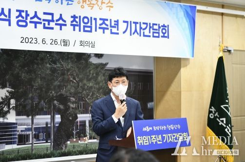 미디어아워 기자 | 최훈식 장수군수는 26일 장수군청 회의실에서 민선8기 출범 1주년 기자간담회를 열어 지난 1년 동안의 변화와 함께 앞으로 장수군이 나아가야 할 방향을 군민들과 공유했다.