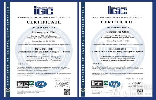 ‘ISO 45001’은 국제표준화기구(ISO)와 국제노동기구(ILO)가 2018년에 제정한 안전·보건 분야 최고 수준의 국제 인증으로서 다양한 유해·위험으로부터 산업재해를 예방하고 쾌적한 근무환경을 조성하기 위한 체계적인 시스템을 갖춘 사업장에만 부여되는데, 이번 인증 획득은 고흥군의 안전·보건 경영시스템이 국제적인 기준에 적합하다는 것을 의미한다.