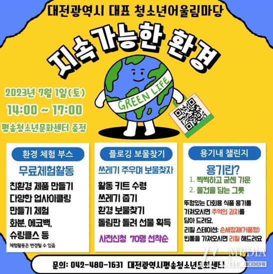 미디어아워 기자 | 대전시는 제3회 청소년어울림마당인 ‘지속 가능한 환경 GREEN DAY’를 오는 7월 1일 오후 2시에 평송청소년문화센터 앞마당에서 개최한다.