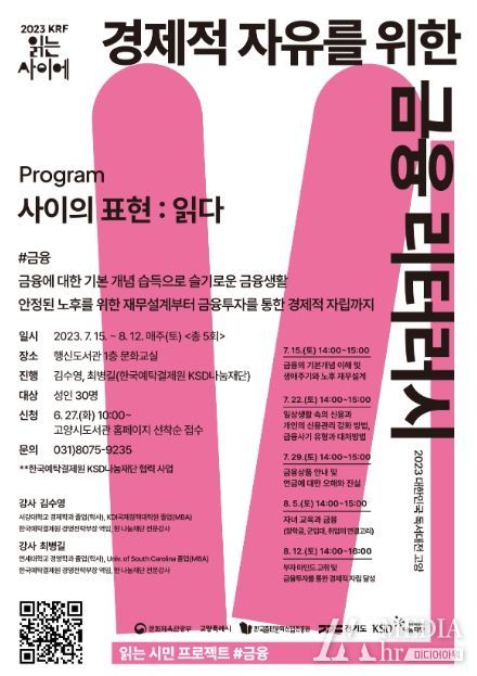 미디어아워 기자 | 고양특례시는 2023 대한민국 독서대전을 기념해 ‘읽는 시민 프로젝트’라는 이름으로 다양한 시민 강좌를 운영하고 있다. 오는 7월 15일부터 다음달 12일까지 행신도서관은 ‘경제적 자유를 위한 금융리터러시’를 운영한다.